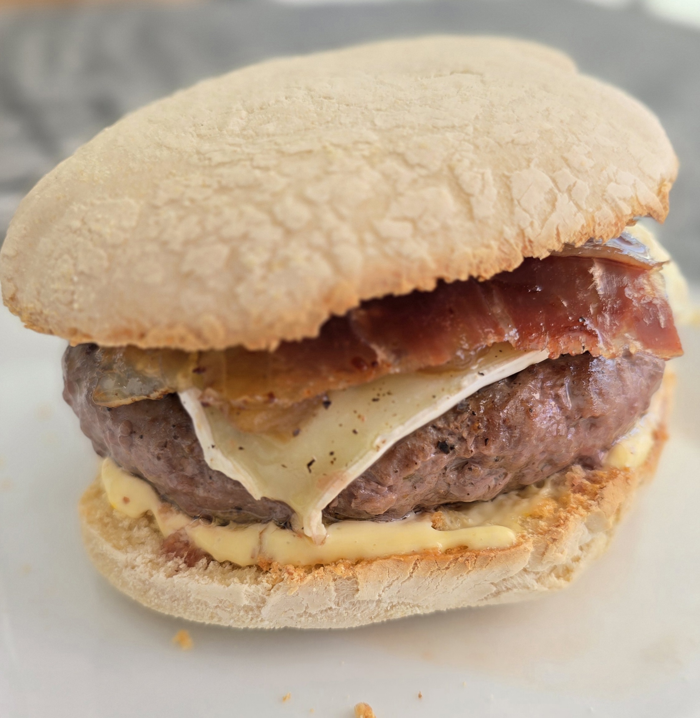 Con pan de Mollete, carne de vacuno seleccionada, cebolla caramelizada, queso brit, jamón iberico y salsa especial Amolatapa