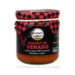 Ingredientes: carne de venado (75%), zanahoria, cebolla, puerro, apio, vino blanco (sulfitos), aceite de oliva virgen extra (A.O.V.E.), brandy, ajo, harina de maíz, agua, soja, huevo, trigo, sal, especias y plantas aromáticas.